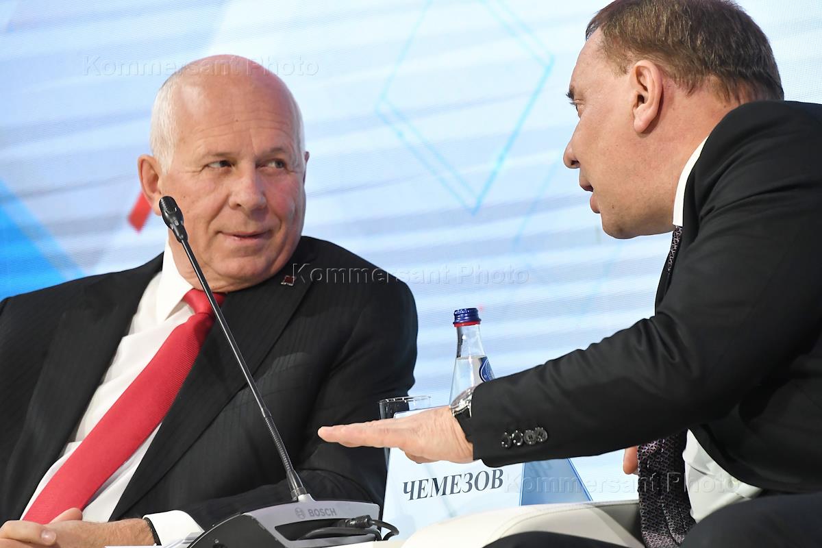 Всероссийский Форум-выставка "ГОСЗАКАЗ" на территории ВДНХ. Генеральный директор Государственной корпорации по содействию разработке, производству и экспорту высокотехнологичной промышленной продукции "Ростех" Сергей Чемезов (слева) и заместитель председателя правительства России Юрий Борисов (справа) во время пленарного заседания "Закупки высокотехнологичной отечественной продукции: опыт субъектов естественных монополий и госкорпораций" в рамках форум-выставки.