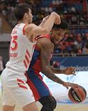 Евролига по баскетболу. Матч между командами ЦСКА (Москва, Россия) - "Црвена Звезда" (Белград, Сербия) во Дворце спорта "Мегаспорт". Игрок команды ЦСКА Майкл Джеймс (справа) во время матча.