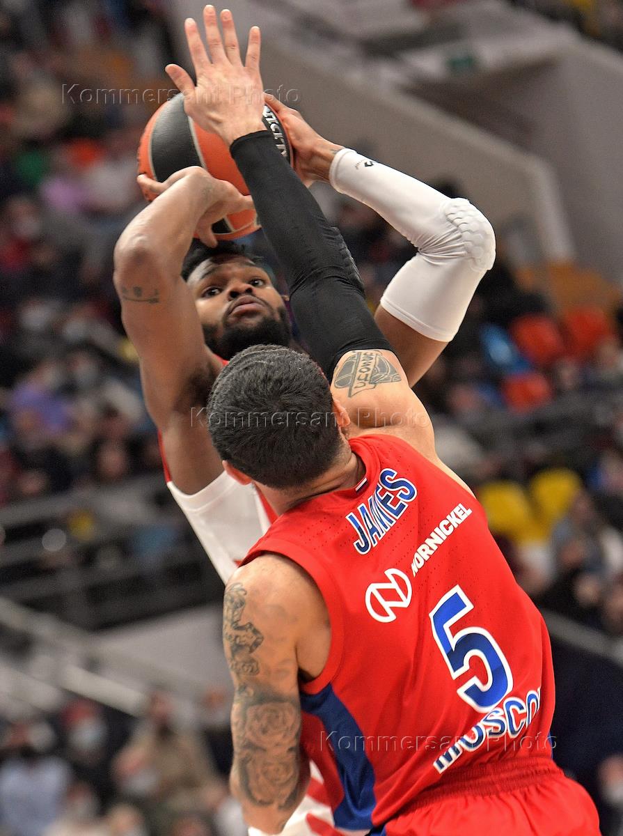 Евролига по баскетболу. Матч между командами ЦСКА (Москва, Россия) - "Црвена Звезда" (Белград, Сербия) во Дворце спорта "Мегаспорт". Игрок команды ЦСКА Майк Джеймс (слева) и игрок команды "Црвена Звезда" Кори Уолден (справа) во время матча.