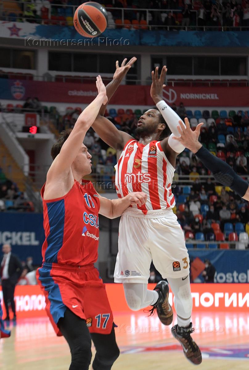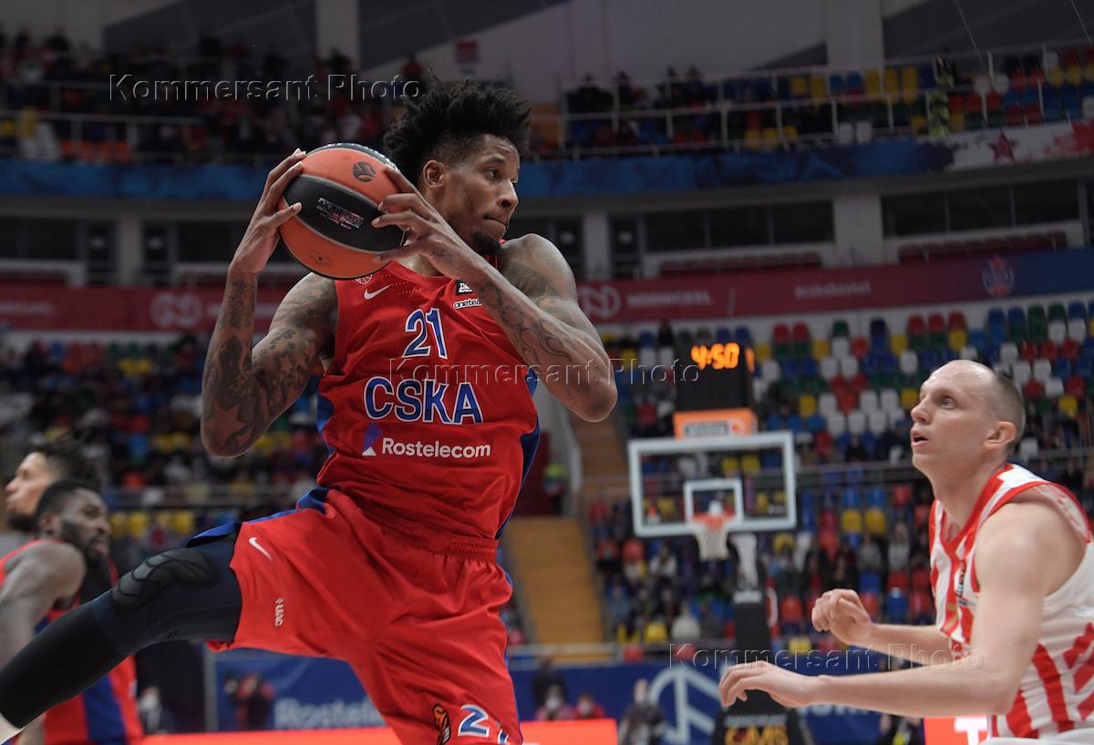 Евролига по баскетболу. Матч между командами ЦСКА (Москва, Россия) - "Црвена Звезда" (Белград, Сербия) во Дворце спорта "Мегаспорт". Игрок команды ЦСКА Уилл Клайберн (слева) во время матча.