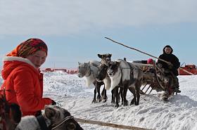 Празднование Дня оленевода-2021 на набережной реки Полябта. Жанровая фотография. Оленеводы во время традиционных соревнований на оленьих упряжках.