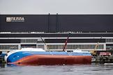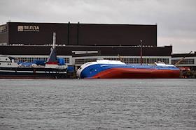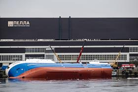 Последствия чрезвычайного происшествия на судостроительном заводе "Пелла". Крен рыболовецкого траулера "Скорпион" у причальной стенки завода. 30 марта строящееся судно дало крен, в результате чего произошло затопление трюмов. Как отметили в МЧС, шесть рабочих смогли самостоятельно эвакуироваться. Еще двоих человек ищут.
