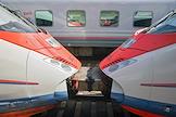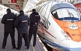 Жанровая фотография. Скоростной поезд "Сапсан" у платформы на железнодорожном вокзале. Сотрудники полиции у поезда.