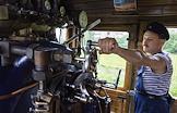 Машинист паровоза в кабине старинного поезда. Железнодорожный транспорт.