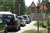 Жанровая фотография. Автомобили стоят на оборудованном переезде в ожидании поезда. Предупреждающие дорожные знаки.