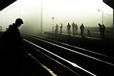 Железнодорожный транспорт. Пассажиры на железнодорожной станции во время тумана ждут поезд на перроне.