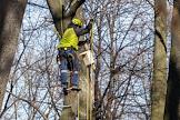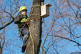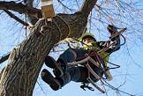Виды Санкт-Петербурга. Жанровая фотография. Сотрудник парковой службы в альпинистском снаряжении крепит скворечник на одном из деревьев Летнего сада во время экологического праздника "Скворцы прилетели".