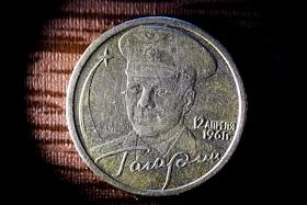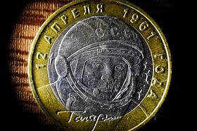 Жанровая фотография. Деньги. Монета с барельефом первого космонавта СССР Юрия Гагарина и надпись "12 апреля 1981 года".