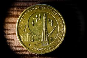 Жанровая фотография. Деньги. Монета с барельефом космического корабляи надпись "50 лет первого полета человека в космос".
