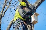 Экологический праздник "Скворцы прилетели" в Летнем саду. Участник праздника вешает скворечник на дерево.