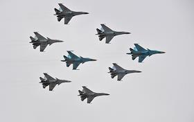 Первая совместная репетиция парадных расчетов, экипажей военной техники и авиационных экипажей Парада Победы 9 мая 2021 года на Красной площади на полигоне "Алабино". Многоцелевые истребители Су-30СМ и МиГ-29 пилотажных групп "Русские витязи" и "Стрижи" во время репетиции.