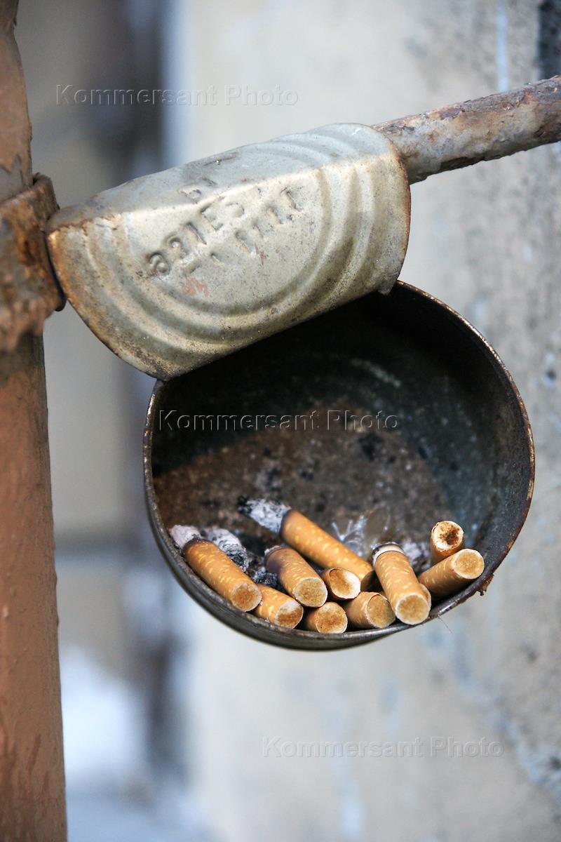 Жанровая фотография. Выделенная зона для курения. Окурки в железной банке из-под консервов.