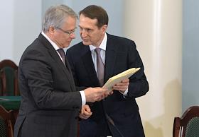 A roundtable discussion on the historical role of Russia in space exploration was held at the Bauman Moscow State Technical University. Chairman of the Russian Historical Society Sergei Naryshkin (left) and President of the Russian Academy of Sciences (RAS) Alexander Sergeev (right) during a meeting.