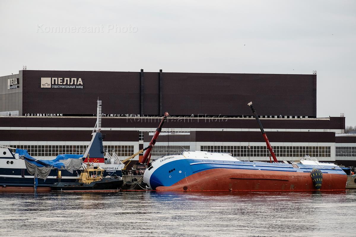 Последствия черезвычайного происшествия на судостроительном заводе "Пелла". У причальной стенки завода перевернулся рыболовецкий траулер "Скорпион". Есть пострадавшие.