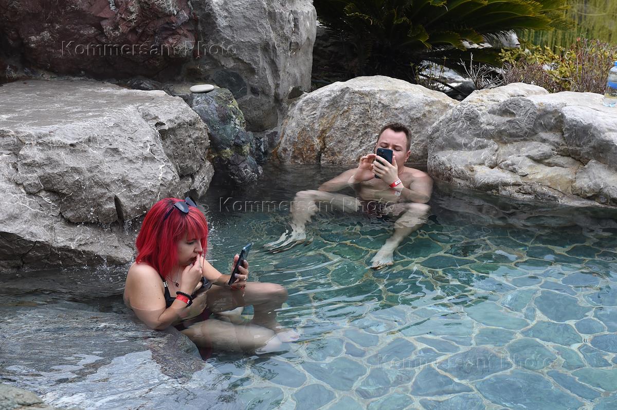 Виды Ялты. Жанровая фотография. Японский сад "Шесть чувств" на территории отеля Mriya Resort & SPA. Отдыхающие в бассейне отеля.
