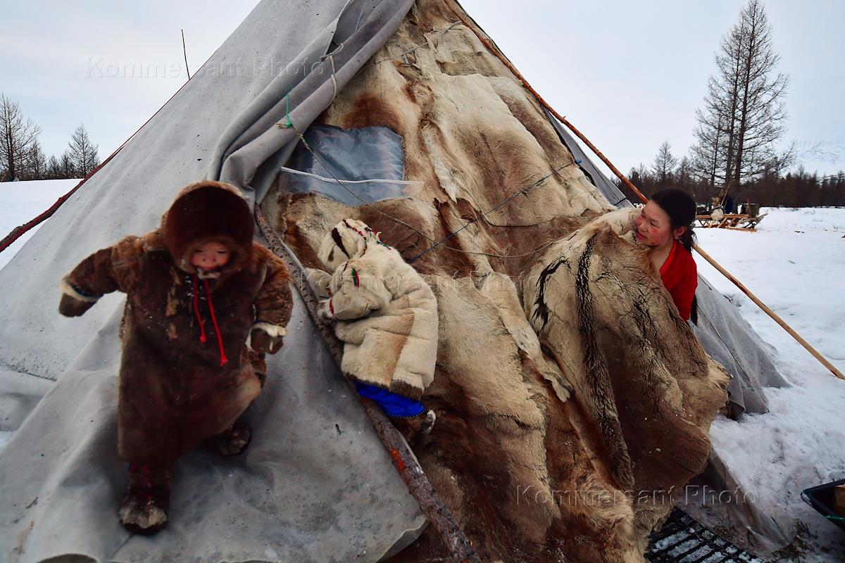 Ненецкие оленеводы Полярного Урала. Жанровая фотография. Оленеводы на зимнем стойбище. Дети семьи Ледковых