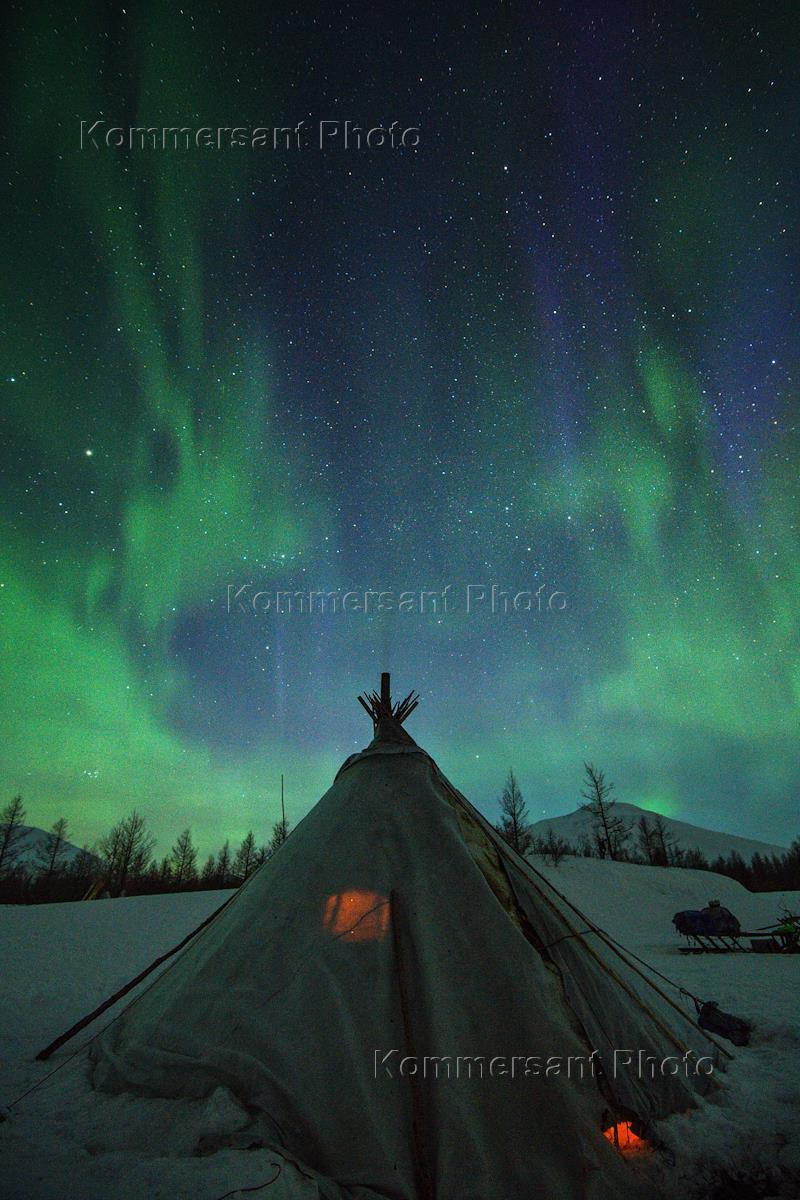 Ненецкие оленеводы Полярного Урала. Жанровая фотография. Оленеводы на зимнем стойбище. Северное сияние.