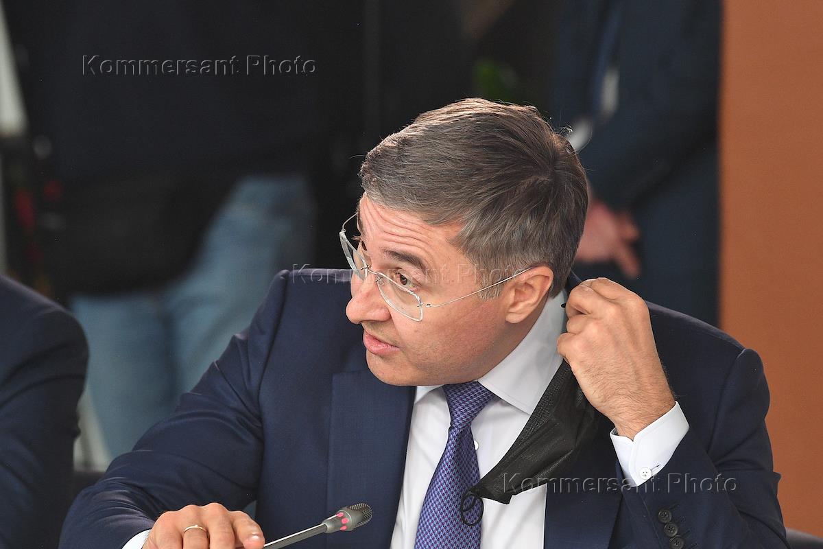 Председатель правительства России Михаил Мишустин в День космонавтики посетил Московский авиационный институт (МАИ). Ректор МАИ Михаил Погосян (слева) и министр науки и высшего образования России Валерий Фальков (справа) во время встречи председателя правительства России Михаила Мишустина со студентами и аспирантами авиакосмических вузов.