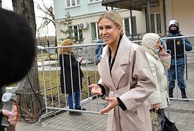 Рассмотрение уголовного дела в отношении юриста Фонда борьбы с коррупцией Любови Соболь, обвиняемой в незаконном проникновении в квартиру тещи сотрудника ФСБ Константина Кудрявцева, в Перовском районном суде. Ситуация у суда. Юриста Фонда борьбы с коррупцией Любовь Соболь (слева) перед началом заседания суда.