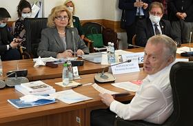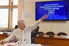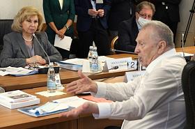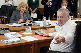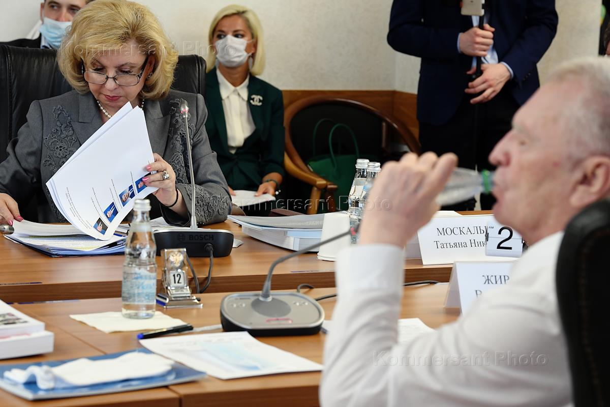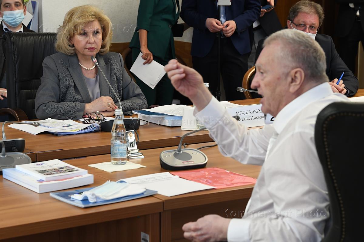 Встреча депутатов фракции Либерально-демократической партии (ЛДПР) Государственной думы (ГД) России с уполномоченным по правам человека в России Татьяной Москальковой в ГД России. Лидер Либерально-демократической партии России (ЛДПР) Владимир Жириновский (слева) и уполномоченный по правам человека в России Татьяна Москалькова (справа) во время встречи.