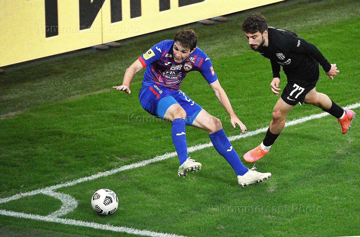 Российская Премьер-Лига (РПЛ). Тинькофф - Чемпионат России по футболу 2020/2021. 25-й тур. Матч между командами ЦСКА (Москва) - "Ротор" (Волгоград) на стадионе "ВЭБ Арена". Игрок команды ЦСКА Георгий Щенников (слева) во время матча.