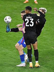 Российская Премьер-Лига (РПЛ). Тинькофф - Чемпионат России по футболу 2020/2021. 25-й тур. Матч между командами ЦСКА (Москва) - "Ротор" (Волгоград) на стадионе "ВЭБ Арена". Игрок команды ЦСКА Хосе Саломон Рондон (слева0 и игрок команды "Ротор" Седрик Гогуа (в центре) во время матча.