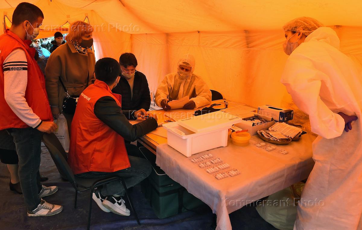 Вакцинация населения от коронавирусной инфекции COVID-19 вакциной Гам-КОВИД-Вак ("Спутник V") в передвижном медицинском пункте на площади Ленина в Симферополе. Жанровая фотография.