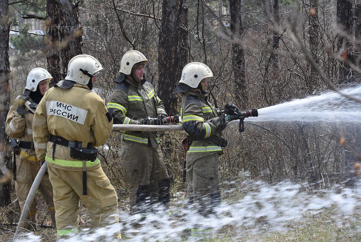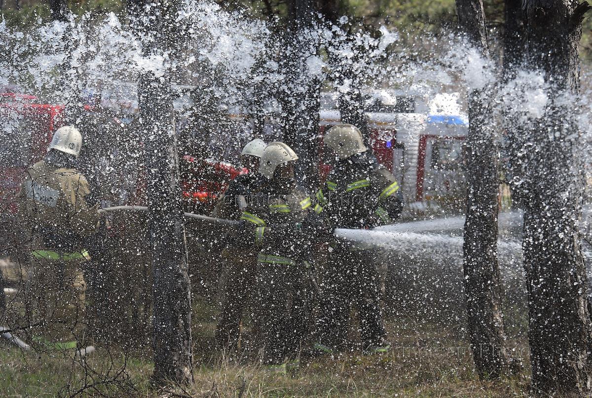 Учения МЧС России по ликвидации лесного пожара. На территории Республики Крым введен особый противопожарный режим. Пожарные во время тушения лесного пожара.