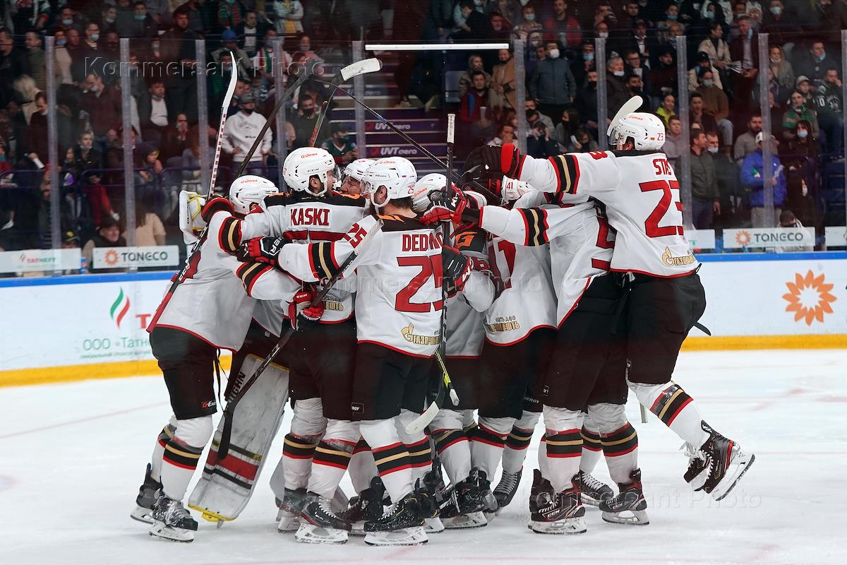 Континентальная хоккейная лига (КХЛ). Чемпионат сезона 2020/21. Матч между командами "Ак Барс" (Казань)- "Авангард" (Омск) на стадионе "Татнефть-Арена". Игрок команды "Ак Барс" Станислав Галиев (слева) и игрок команды "Авангард" Клим Костин (третий справа) во время матча.