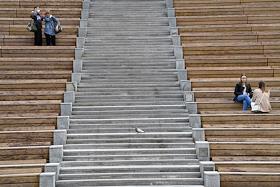 Жанровая фотография. Весна в Москве. Компания молодых людей на ступенях амфитеатра в ландшафтном парке "Зарядье".