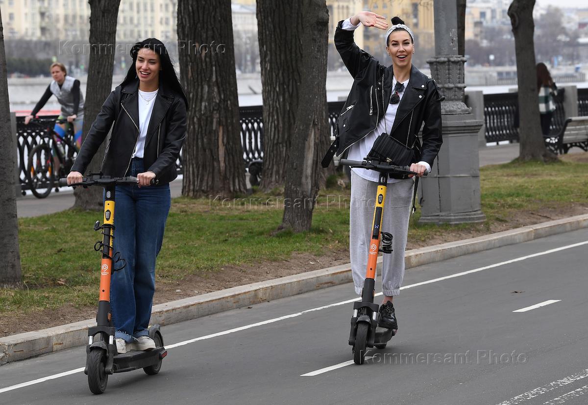 Жанровая фотография. Весна в Москве. Парень с девушкой вдвоем едут на электросамокате.