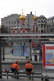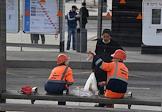 Виды Москвы. Славянская площадь. Жанровая фотография. Рабочие ГБУ "Автомобильные дороги" на остановке общественного транспорта в станции метро "Китай-город".