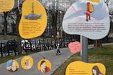 Виды Москвы. Жанровая фотография. Отдыхающие в Ландшафтном парке "Зарядье". Афиша на светодиодном экране на фасаде Концертного зала "Зарядье".
