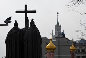 Виды Москвы. Славянская площадь. Памятник Кириллу и Мефодию в Ильинском сквере. Купола церкви Всех Святых на Кулишках и шпиль жилой высотки на Котельнической набережной.