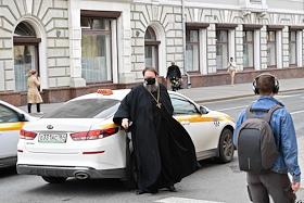 Виды Москвы. Ильинская улица. Жанровая фотография. Священнослужитель в защитной маске при выходе из автомобиля такси.