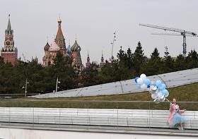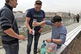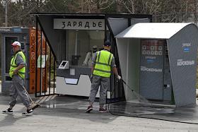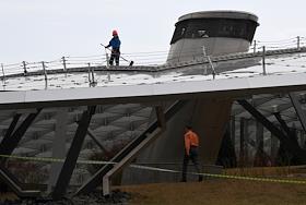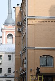 Виды Москвы. Жанровая фотография. Рабочий моет крышу амфитеатра в ландшафтном парке "Зарядье".