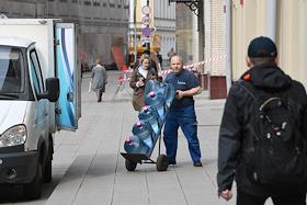Виды Москвы. Жанровая фотография. Сотрудник службы доставки воды "Королевская вода" везет тележку с бутылками питьевой воды.