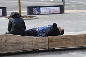Жанровая фотография. Весна в Москве. Сотрудники ГБУ "Автомобильные дороги" на остановке общественного транспорта.