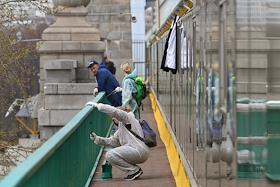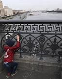 Жанровая фотография. Весна в Москве. Рабочий во время покраски перил моста.