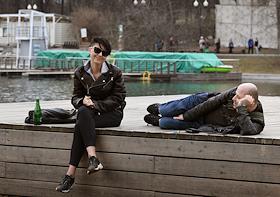 Жанровая фотография. Весна в Москве. Женщина и мужчина на деревянном помосте на набережной Москвы-реки.