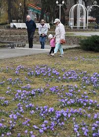 Жанровая фотография. Весна в Москве. Первоцветы на газоне в парке.
