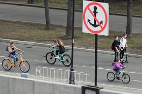 Жанровая фотография. Весна в Москве. Взрослые и дети катаются на велосипедах и самокаты по дорожкам паркам на набережной Москва-реки.
