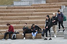 Жанровая фотография. Весна в Москве. Компания молодых людей на ступенях амфитеатра в ландшафтном парке "Зарядье".