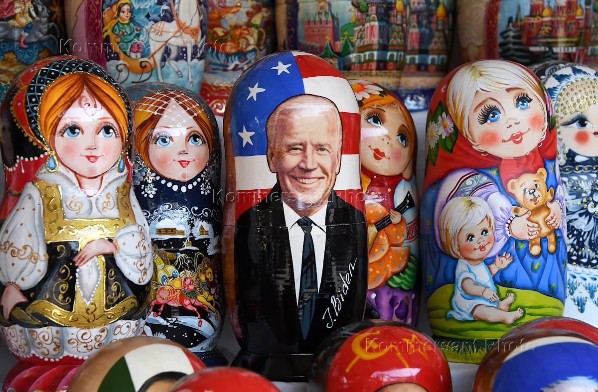 Жанровая фотография. Сувенирный киоск по продаже матрешек с изображением президента России Владимира Путина, президента США Джозефа Байдена и других мировых лидеров.