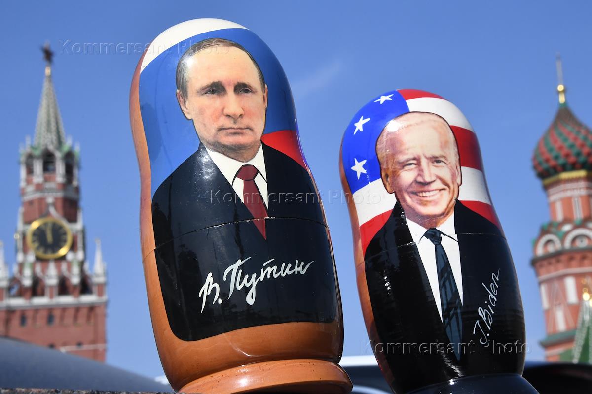 Жанровая фотография. Матрешки с изображением президента России Владимира Путина и президента США Джозефа Байдена на фоне башни Московского Кремля.