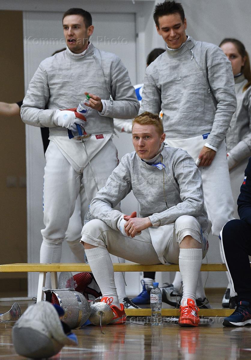 Чемпионат России по фехтованию в Сибирском региональном центре фехтования Станислава Позднякова. Спортсмены во время соревнований. Российский фехтовальщик Илья Моторин (в центре) во время командных соревнований саблистов.