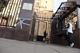 Виды Москвы. Здание посольства Чешской Республики. Жанровая фотография. Сотрудник курьерской службы доставки DHL Express и сотрудник полиции у проходной посольства.