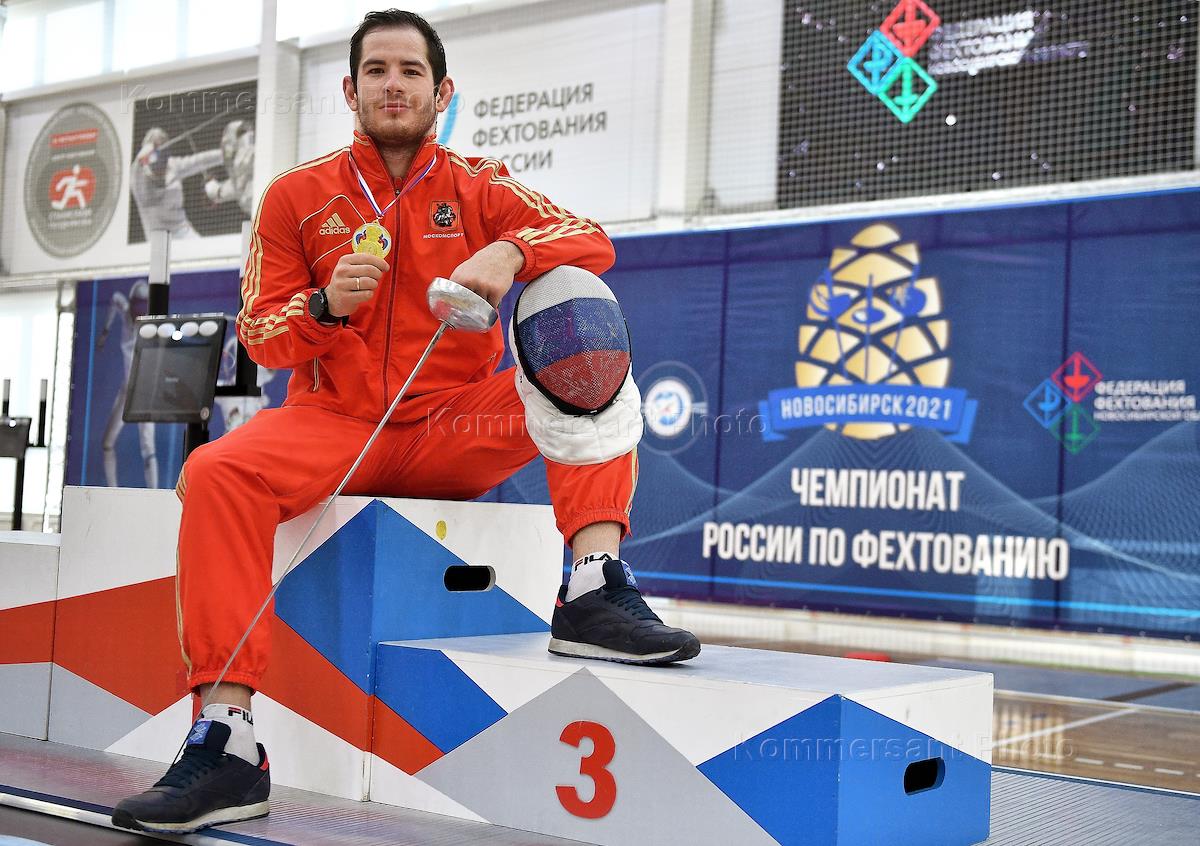 Чемпионат России по фехтованию в Сибирском региональном центре фехтования Станислава Позднякова. Личное первенство по шпаге среди мужчин. Российский фехтовальщик Сергей Бида во время церемонии награждения.