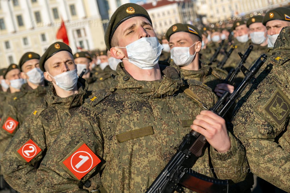 Репетиция военного парада в ознаменование 76-й годовщины Победы в Великой Отечественной войне прошла на Дворцовой площади. Военнослужащие Западного военного округа во время репетиции.
