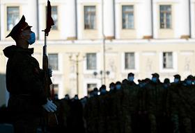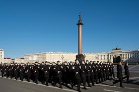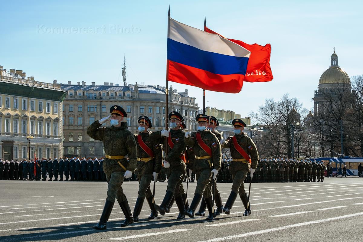 Репетиция военного парада в ознаменование 76-й годовщины Победы в Великой Отечественной войне прошла на Дворцовой площади. Военнослужащие Западного военного округа и сотрудники силовых ведомств во время репетиции.